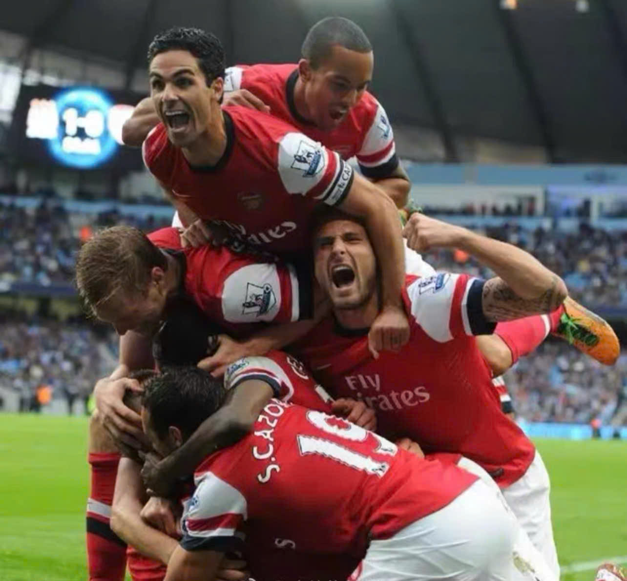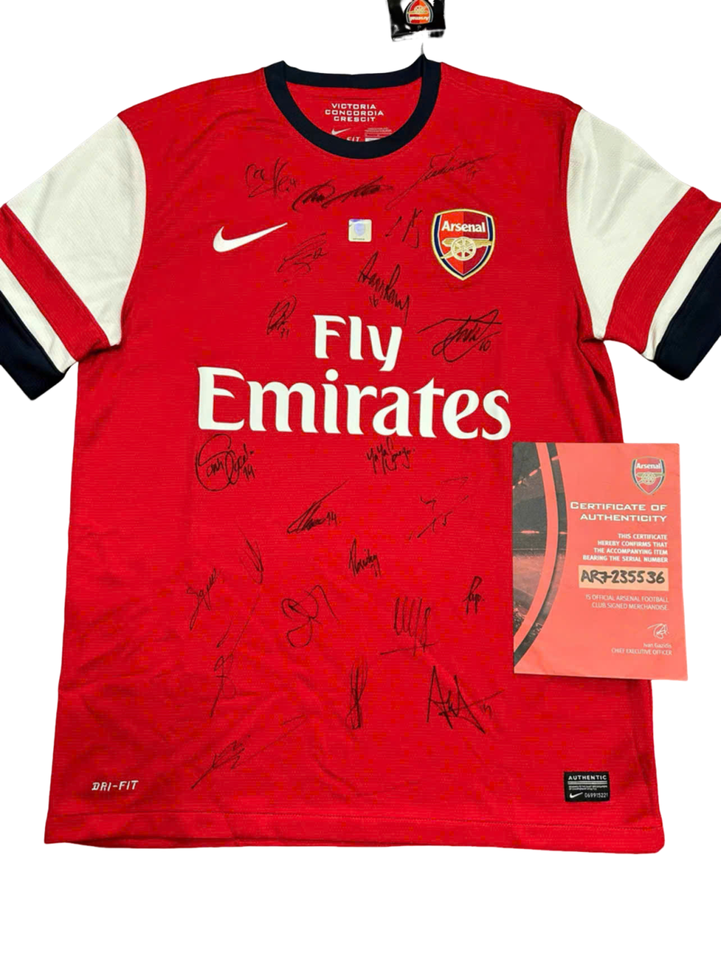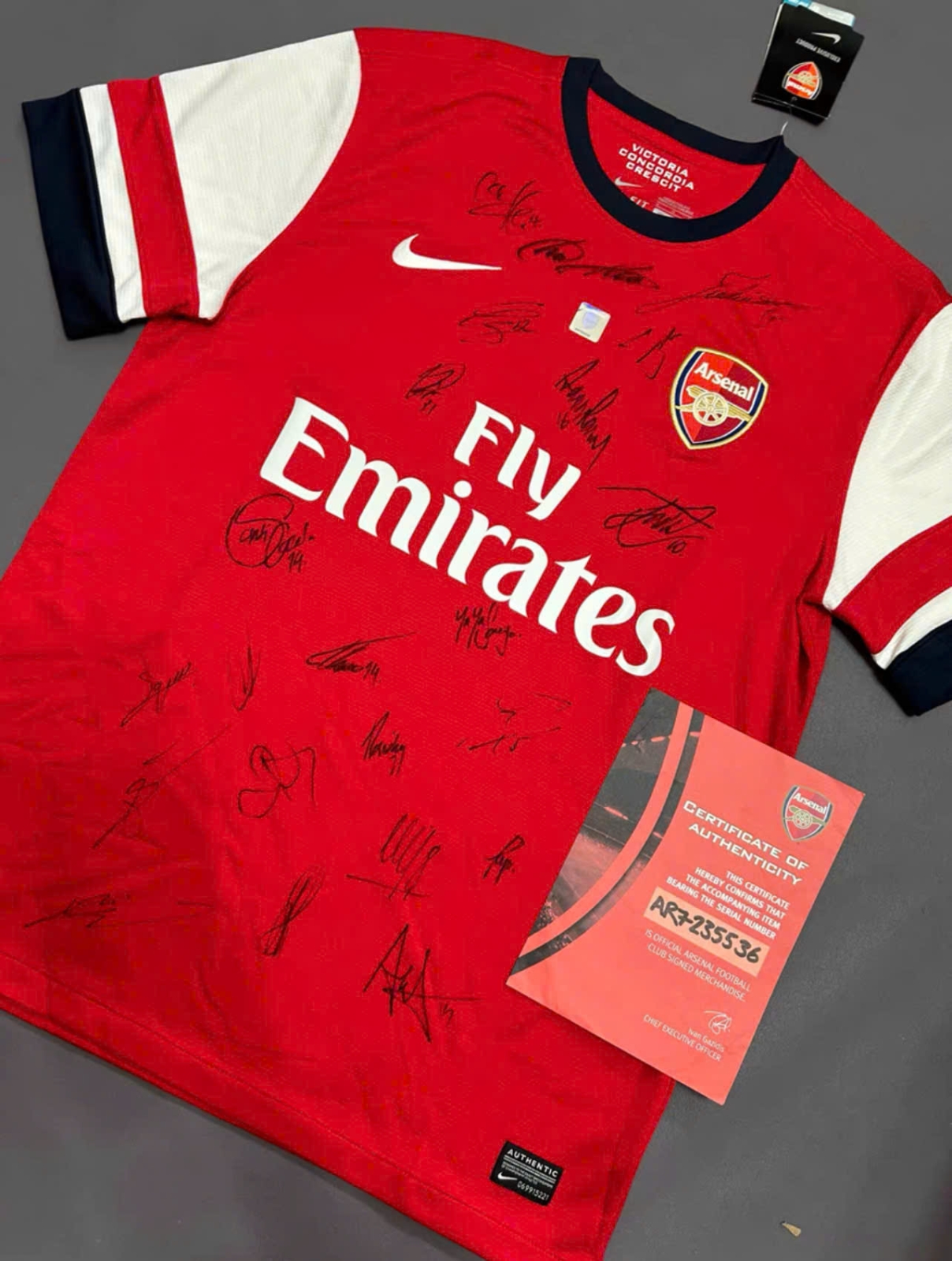 Có chữ ký của tất cả 22 cầu thủ Arsenal, bao gồm Arteta, Giroud, Podolski, Cazorla, Ramsey, v.v.